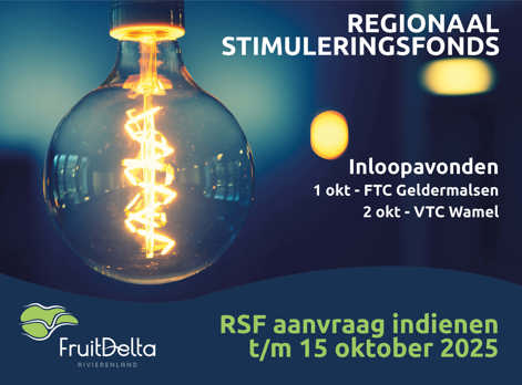 Ondernemers en verenigingen in Rivierenland kunnen van 4 augustus tot en met 15 oktober 2025 een aanvraag indienen bij FruitDelta Rivierenland voor financiële ondersteuning uit het Regionaal Stimuleringsfonds (RSF). Het fonds richt zich op innovatieve projecten binnen de economische speerpunten van de regio: Agribusiness, Logistiek & Vestigingsklimaat Bedrijven en Recreatie & Toerisme.