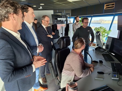 Wij startten het werkbezoek op een unieke locatie: de Verkeerspost Tiel van Rijkswaterstaat. Deze verkeerspost, die 24/7 wordt bemenst, staat op de strategische locatie waar het Amsterdam-Rijnkanaal in de Waal uitmondt. Een plek waar verschillende scheepvaartstromen in goede ‘banen’ moeten worden geleid. Dat gebeurt vanuit de Verkeerspost Tiel, die overigens verantwoordelijk is voor een nóg groter gedeelte: van Lobith tot Gorinchem.