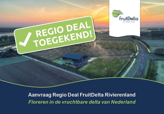 Het Rijk draagt € 22,5 miljoen bij aan de Regio Deal FruitDelta Rivierenland. Dat maakte het kabinet afgelopen vrijdag bekend. “De bijdrage van het Rijk is geweldig nieuws voor onze regio en een fantastische impuls om samen te werken aan het toekomstbestendig wonen, ondernemen en leven in Rivierenland”, aldus Servaas Stoop, voorzitter van Regio Rivierenland.